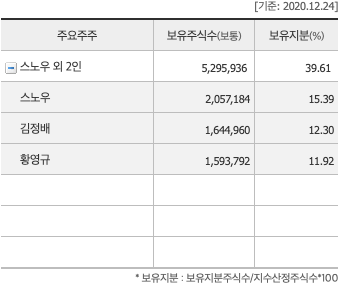 알체라(347860)의 주요주주를 확인을하면 보유지분 39%눈 스노우,김정배,황영규로 되어 있습니다. 스노우 어디서 많이 본거 같은데요