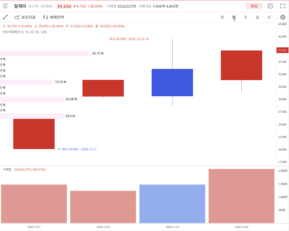 2020년 12월 24일 상을 가서 찾아보기 시작했습니다. 거래대금이 7500억 정도 이며 거래량이 2천만 정도였습니다.