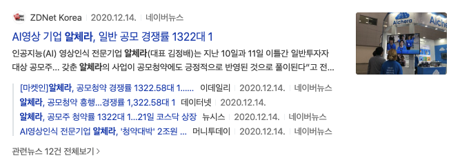 알체라(347860)의 일반청약 1,323대 1 기록 했다는 기사가 2020년 12월 11일에 나왔고