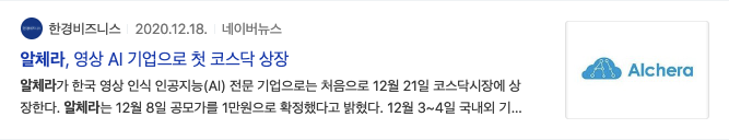 알체라(347860) 영상 AI 기업으로 첫 코스닥 상장이라는 뉴스제목을 볼 수 있습니다. 알체라가 한국 영상 인식 인공지능 전문 기업이라는 소개와 함께 내용이 있습니다.