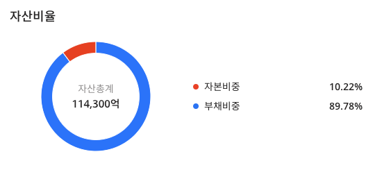 한화투자증권(003450의 자신 비율은 자본비중 : 10.22%, 부채비중 89.78% 로 구성되어 있으며
