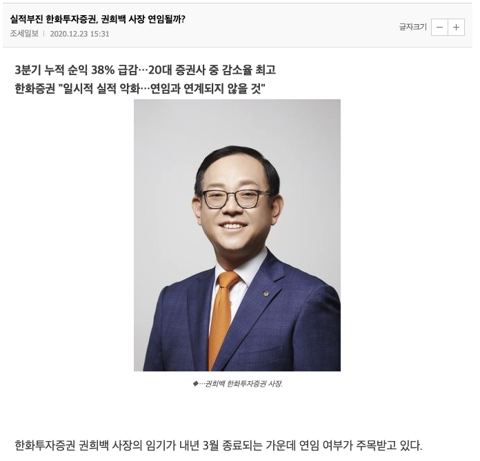 2020년 12월 23일 한화투자증권 심란한 연말 맞은 이유라는 기사 제목을 볼 수 있습니다. 기사내용을 보면 1분기 전자 실적에 발목이라는 내용을 볼수 있습니다.