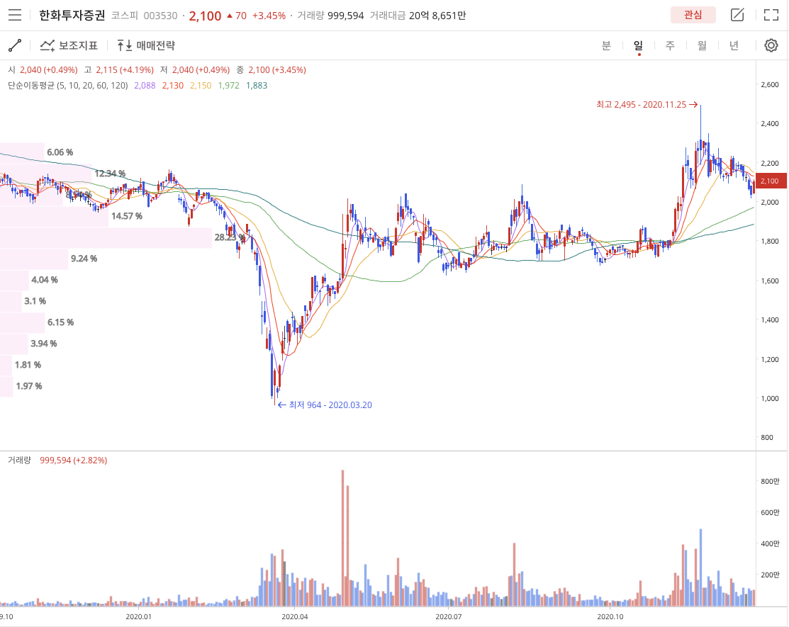 한화투자증권은 최근 COVID-19 2020년 3월 20일 52주 저점 964원을 찍고 2020년 11월 25일 52주 고점 2,495원을 찍고 2020년 12월 24일 2,100원으로 장을 마감했습니다. 24일 거래대금은 대략 20억 거래량은 대략 1,000,000 정도 나왔습니다.