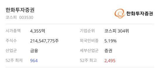 한화투자증권(003450)은 코스피 304위 종목이며 산업군은 금융, 세부산업군은 증권으로 분류가 되어 있습니다.