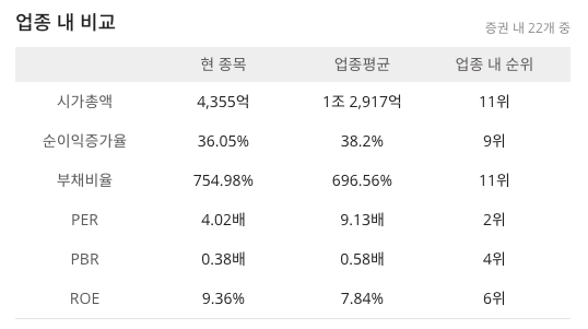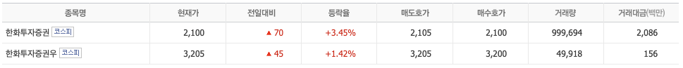 한화투자증권(003450)은 세부산업군 증권 기준으로 증권내 22개 중 업종 내 시가총액 11위(4,344억)이며 한화투자증권과 한화투자증권우 가 있으며 본주보다 우선주가 가격이 높은 상태입니다.