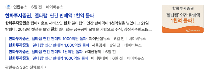 한화투자증권 최근 뉴스동향을 보겠습니다. 2020년 12월 21일 한화투자증권 델타랩 연간 판매액 1천억 돌파라는 뉴스제목을 볼 수 있습니다.