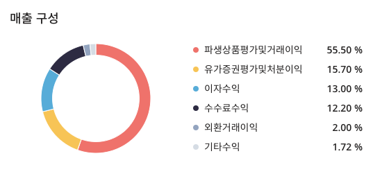 한화투자증권(003450)의 매출구성은 파생상품평가및거래이익 : 55.50%, 유가증권평가및처분이익 : 15.70%, 이자수익 : 13.00%, 수수료수익 : 12.20%, 외환거래이익 : 2.00%, 기타수익 : 1.72% 로 구성되어 있습니다.