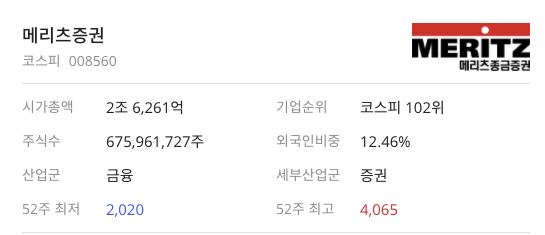 이번 포스팅은 2020년 배당을 받기 위해서 3프로가 올랐을까 하는 생각으로 이번 포스팅을 하게 되었습니다. 메리츠증권(008560)의 종목 정보를 알아보는 시간입니다.