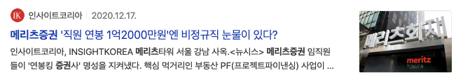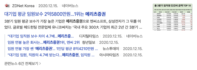 2020년 12월 15일 대기업 평균 임원보수 1위는 메리츠증권 이라는 기사제목을 볼 수 있습니다. 기사 내용은 임원도 직원도 임금이 높다라는 내용이 있습니다.
