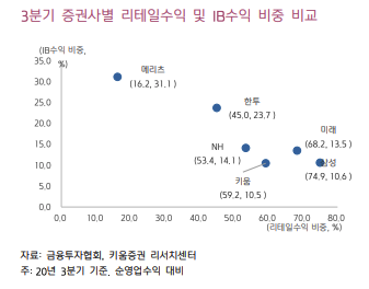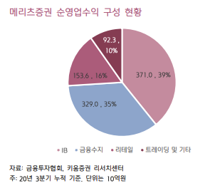2020년 9월 전년동기 대비 영업이익 26.7% 증가, 당기순이익 7.4% 증가. ELS 등 운용 부문 전체의 실적 호조에 따라 트레이딩 수익이 1,404억원(QoQ-7.1%)으로 전분기에 이어 강세를 보였으며, 위탁매매 수익 또한 245억원(QoQ+27.6%)으로 실적 호조에 기여. 자회사인 메리츠캐피탈 실적 또한 순이익 389억원(QoQ+11.1%) 기록. 다만 고정이하여신과 대손충당금전입액 증가로 기타 손익 부분 부진하다고 합니다.