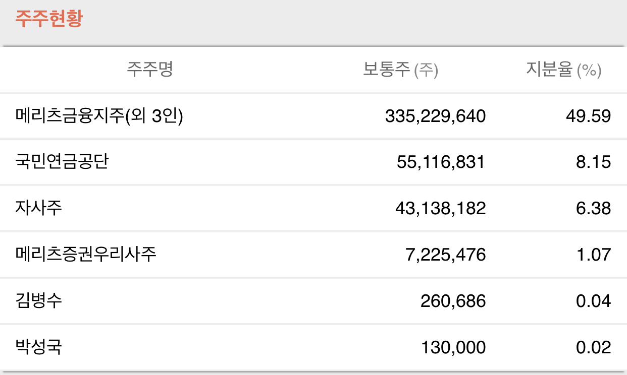 메리츠증권의 주주현황은 메리츠금융지주(외 3인)이 49%를 가지고 있습니다.