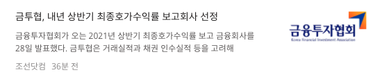 2020년 12월 28일 금융투자협회 내년 상반기 최종호가수익률 보고회사 선정이라는 기사 제목을 볼 수 있습니다.