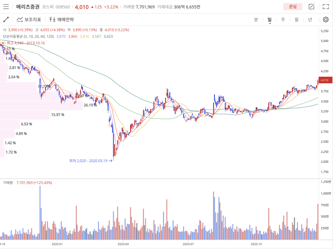메리츠증권은 COVID-19 52주 저점 2,020원을 찍고 52주고가 작년 2019년 12월 27일 4,065원을 오늘 뚤어줄지 지켜보고 있습니다. 현재 장중에 고는 4,055원이며 현재 4,010원인 상태입니다.