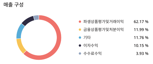 매출구성으로는 파생상품평가및거래이익 : 62.17%, 금융상품몇가및처분이익 : 11.99%, 기타 : 11.76%, 이자수익 : 10.15%, 수수료 수익 : 3.93% 로 구성되어 있습니다.