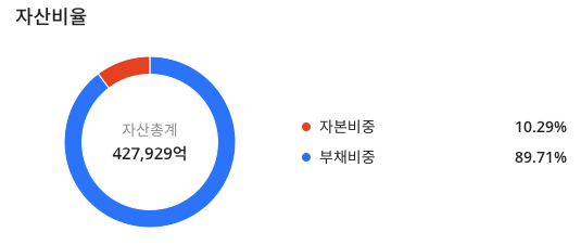 메리츠증권(008560)의 자산비율은 자본비중 : 10.29%, 부채비중 : 89.71% 로 구성되어 있습니다.