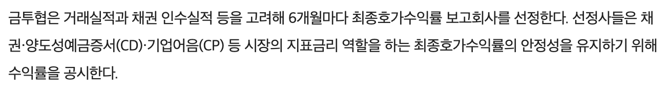 내년 상반기 채권 최종호가수익률 보고회사는 KB증권, NH투자증권, 메리츠증권, 미래에셋대우, 부국증권, 신한금융투자, 하이투자증권, SK증권, 한국투자증권, 현대차증권등 10곳이다.