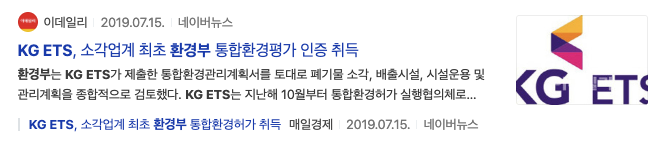 작년 기사부터 한번 정리해보겠습니다. 2019년 7월 15일 소각업계 최초 환경부 통합환경평가 인증 취득했다는 기사제목을 볼 수 있습니다.