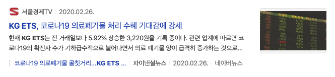 2020년 2월 26일 KG ETS 코로나19 의료폐기물 처리 수혜 기대감에 강세 라는 기사제목을 볼 수 있습니다.