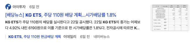 그리고 KG ETS 주단 110월 배당 계획 시가배당율 1.8%라는 기사제목을 볼 수 있습니다.