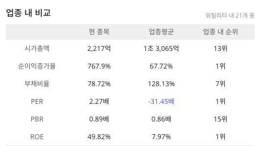 KG ETS(151860)의 세부산업군 : 유틸리티 기준으로 유틸리태 내 21개 중 업종 내 시가총액 13위(2,217억)이며 ROE는 1위에 해당됩니다.