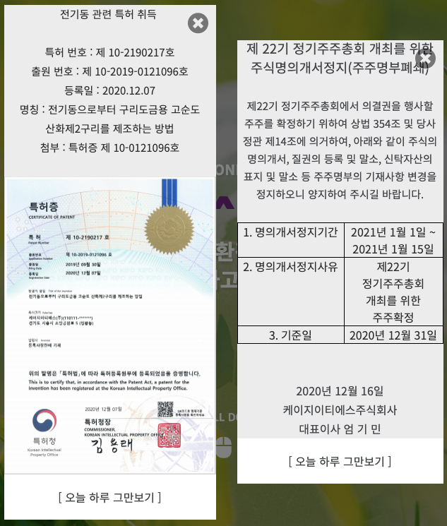 홈페이지에 들어가보니 전기동 관련 특허 취득이 있고 명칭은 : 전기동으로 구리도금용 고순도산화제2구리를 제조하는 방법 이라고 합니다.