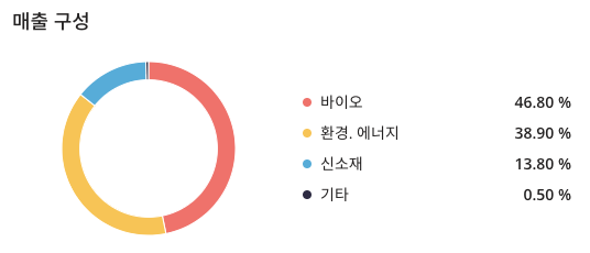 KG ETS(151860)의 매출 구성은 바이오 : 46.80%, 환경,에너지 : 38.90%, 신소재 : 13.80%, 기타 0.50% 로 구성되고 있습니다.