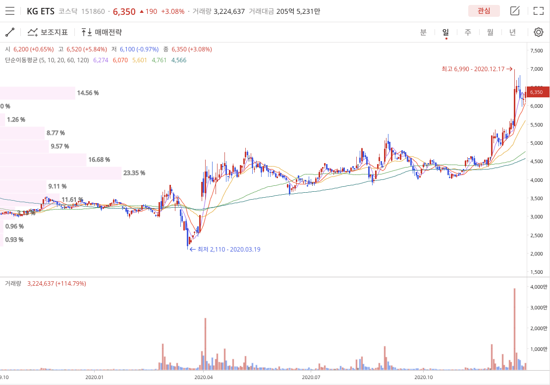 KG ETS(151860)는 COVID-19 52주 저점 2,110원을 찍고 2020년 12월 17일 52주 고점 6,990원을 찍고 2020년 12월 28일 6,350원에서 장이 마감을 했습니다.