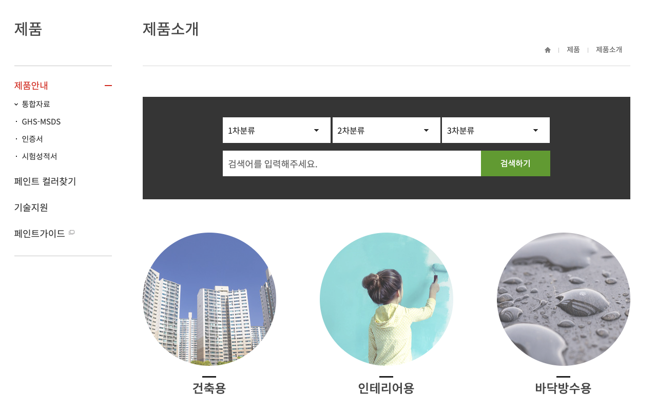 노루페인트의 홈페이지에 제품소개가 있으며 큰 분류로는 총 10가지가 되며 건축용, 인터레아용, 바닥방수용, 목공용, 중방식용, 공업용, 자동차보수용, 에너지절감용, 기타, 하우홈인테리어로 나눠지고있습니다.