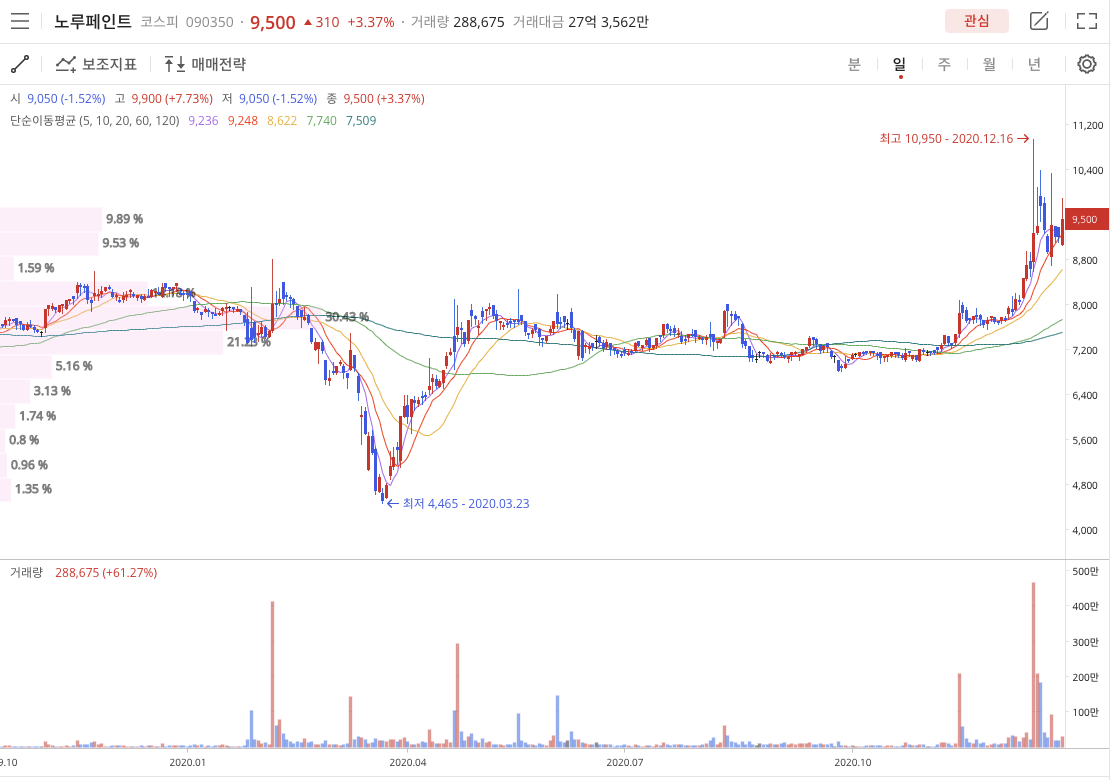 노루페인트(090350)는 COVID-19로 인한 52주 저점 2020년 3월 23일 4,465원을 찍고 최근 2020년 12월 16일 52주 고점 10,950원을 찍고 2020년 12월 29일 장중 가격은 9,500원 입니다.