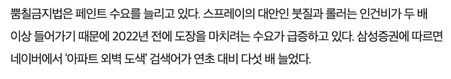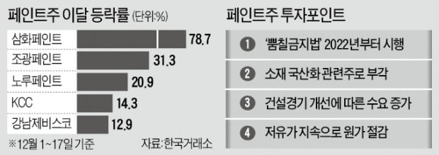 2020년 12월 17일과 18일 관련 호재는 뿜칠금지법이라고 불리고 있는 대기환경보전법 시행규칙 개정에 따라서 2022년 부터 건물의 외벽에 스프레이 방식으로 재도장을 하는것을 금지하기 때문에 그전까지 아파트 외벽 도색을 마치려는 아파트 들이 늘면서 수요가 올라갔기 때문입니다. 스프레이 방식으로 안하면 인건비가 2배로 들어가기 때문입니다. 뿜칠 포함 호제가 4개가 있습니다.