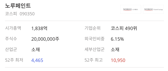 노루페인트(090350)는 코스피 490위 기업으로 산업군은 소재, 세부산업군은 소재, 코스피는 화학으로 분류도히고 WICS : 건축자재로 분류가 되어 있습니다.