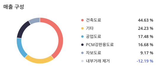 노루페인트(090350)는 매출 구성은 건축도료 : 44.63%, 기타 : 24.23%, 공업도료 : 17.48%, PCM강판용도료 : 16.68%, 자보도료 : 9.17%, 내부거래 제거 : -12.19% 입니다.