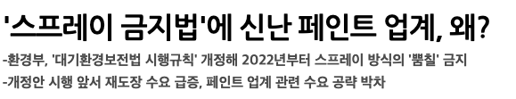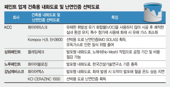 상위 5대 페인트 회사는 KCC, 삼화페인트, 노루페인트, 강남제비스코, 조광페인트 가 있는데 삼화페인트 한 곳을 제외하고 모두 전년 대비 마이너스를 기록했다고 합니다. 그리고 규제 관련은 외부 보관중인 페인트는 자연적으로 폭발하는 경우가 있다고 말하고 페인트관계자가 말했다고 합니다.