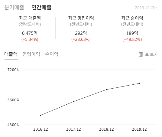 노루페인트(090350)는 2016년부터 지속적으로 매출액이 증가하고 있습니다.