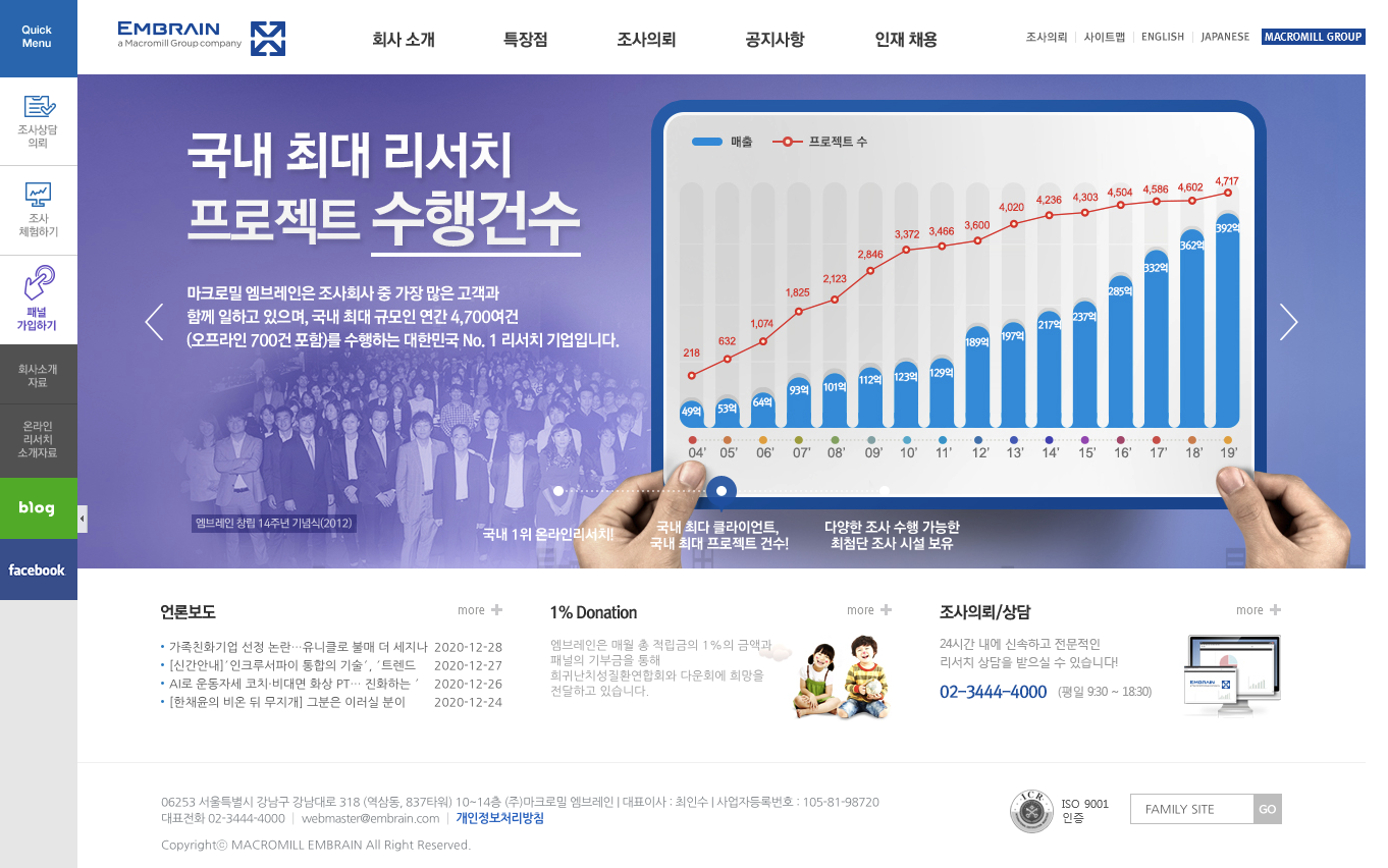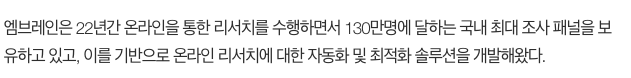 엠브레인(169330)은 1998년 '한국패널리서치'를 설립한 후 2000년 11월 13일 상호를 '엠브레인'으로 변경하였으며, 2012년 7월 17일 '마크로밀엠브레인’으로 상호를 변경하고 영위하고 있는 사업인 리서치는 제품 또는 서비스나 사회 특정 이슈 등에 대해 설문조사를 통해 묻고, 그 질문에 대한 다양한 의견을 데이터화한 후 결과물을 도출하여 제공하는 것입니다.