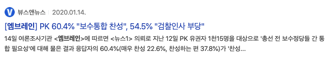 2020년 1월 14일 정치관련 뉴스제목과 함께 여론조사기관 엠브레인이라는 내용을 볼 수 있습니다.