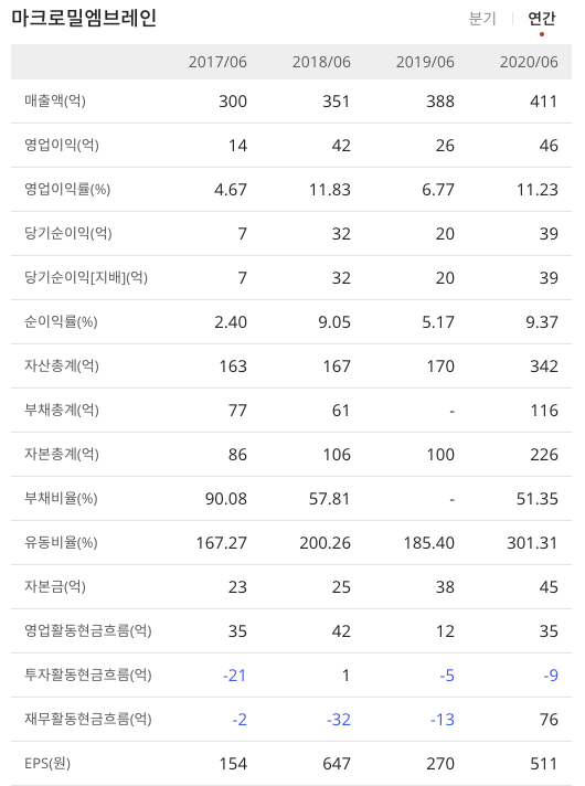 엠브레인(169330)의 연간 매출은 조금식 상승하고 있습니다.