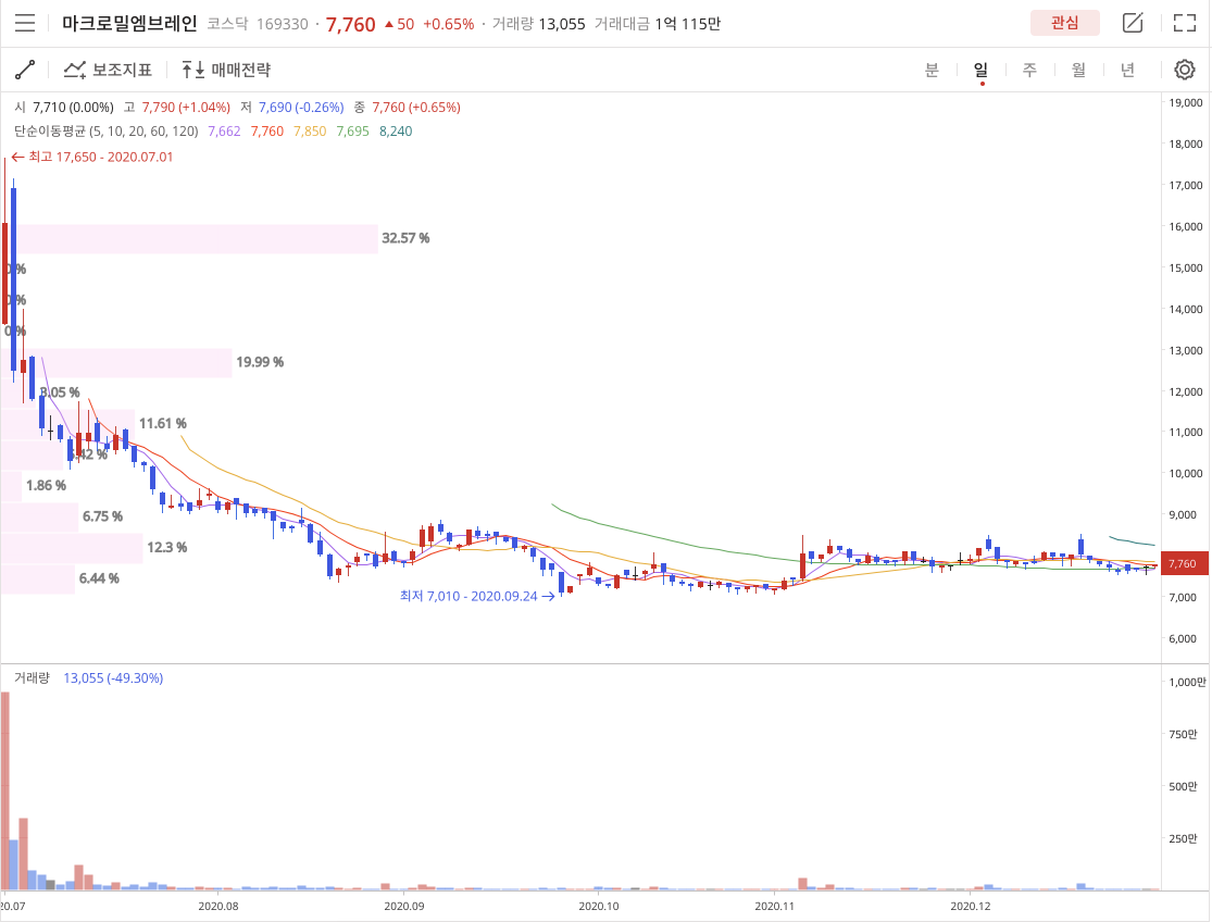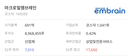 엠브레인(169330)은 2020년 7월 1일에 상장해서 52주 고점 17,650원을 찍고 2020년 9월 24일 52주 저점 7,010원을 찍고 2020년 12월 30일 7,760원에 장을 마감했습니다.