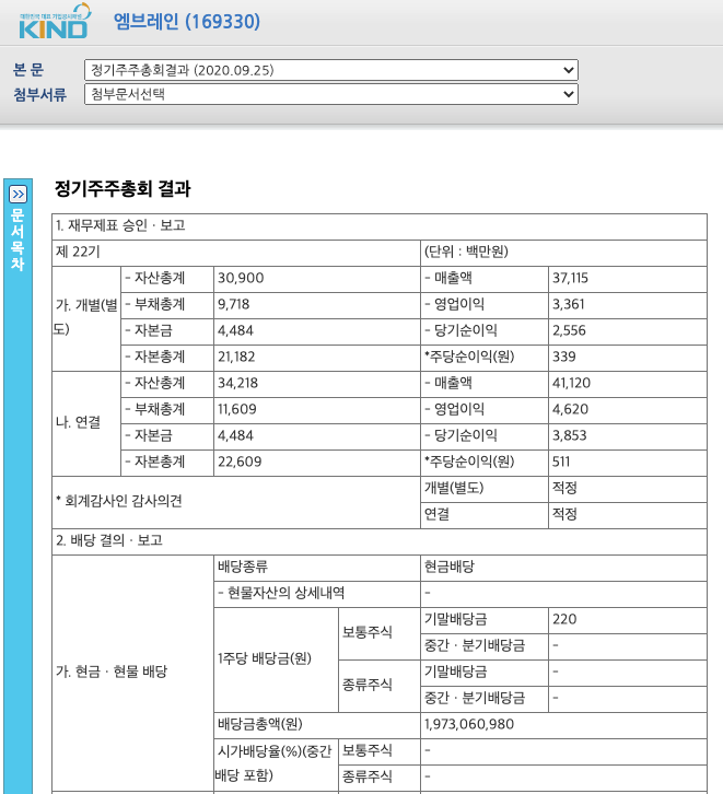 엠브레인(169330)은 주당 220원 배당을 한 종목입니다.
