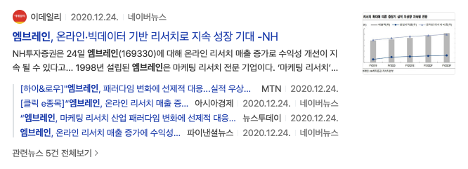2020년 12월 24일 엠브레인, 온라인,빅데이터 기반 리서치로 지속 성장 기대 라는 NH투자증권 기사 제목을 볼 수 있습니다.