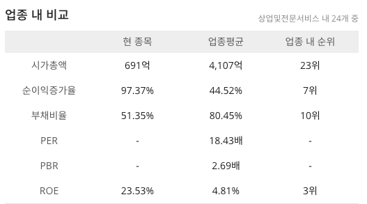 엠브레인(169330)의 세부산업군 기준으로 산업및전문서비스 내 24개 중 업종 내 시가총액 순위 23위(691억)이며 기업순위는 코스닥 : 1,041위에 해당이 됩니다.