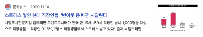 2020년 11월 14일 스트레스 쌓인 현대 직장인들, 번아웃 증후군 시달린다. 라는 기사 제목과 시장조사전문기업 엠브레인이 나와있습니다.