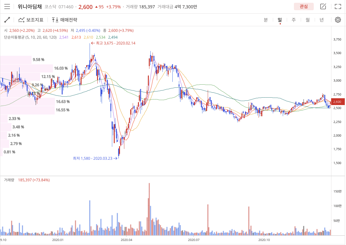 위니아딤채(071460)는 COVID-19 52주 저점 2020년 3월 23일 1,580원을 찍고 2020년 2월 14일 52주 고점 3,675원을 회복을 못하고 있습니다.