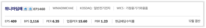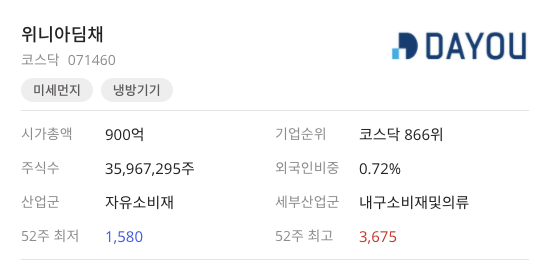 이번포스팅은 위니아딤채(071460)에 대한 종목정보를 알아보려고 합니다. 이 종목을 찾아보게 된 이유는 딤채의 프리미엄 냉장고가 가지고 싶기 때문입니다.