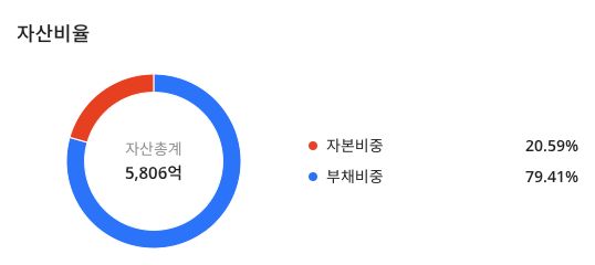 위니아딤채(071460)의 자산비율은 자본비중 : 20.59%, 부채비중 : 79.41% 로 구성되어 있으며 자산 총계는 5,806억입니다.