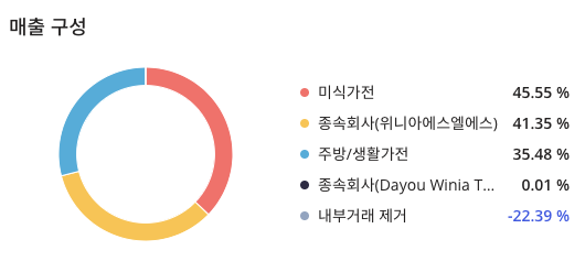 위니아딤채(071460)의 매출 구성으로는 미식가전 : 45.55%, 종속회사(위니아에스엘에스) : 41.35%, 주방/생활가전 : 35.48%, 종속회사(Dayou Winia Thailana) : 0.01%, 내부거래 제거 : -22.39% 로 구성되어 있습니다.