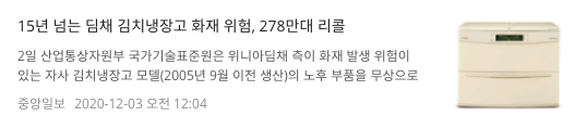 2020년 12월 3일 15년 넘은 딤채 김치냄장고 화재 위험 278만대 리콜을 결정을 했다고 합니다.