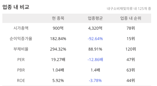 위니아딤채(071460)의 세부산업군 기준으로 내부소비재및의류 내 125개 중 시가총액 78위(900억)입니다.