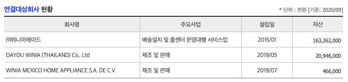 대유위니아 그룹 계열의 종합가전 업체로 에어컨 전문 브랜드 위니아와 김치 냉장고 브랜드 딤채를 주축으로 사업을 하고 있습니다.
