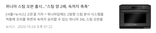 2020년 10월 24일 스팀 오븐 출시 스팀 양 2배, 속까지 촉촉이라는 2방향 스팀 분사를 하는 신제품 관련 뉴스제목을 볼 수 있습니다.